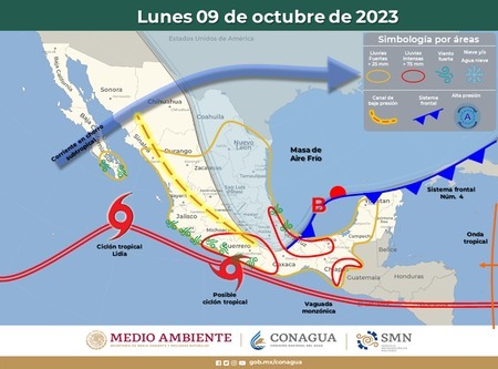 Oaxaca de Juárez, Oax. 9 de octubre de 2023.- La Coordinación Estatal de Protección Civil y Gestión de Riesgos (CEPCyGR) informa a la población que el frente frío número 4, extendido sobre el suroeste del Golfo de México, ha desarrollado en las últimas horas un centro de baja presión a 160 kilómetros al norte de Coatzacoalcos, Veracruz, por lo que aumenta la posibilidad de lluvias fuertes a muy fuertes en regiones del territorio oaxaqueño.