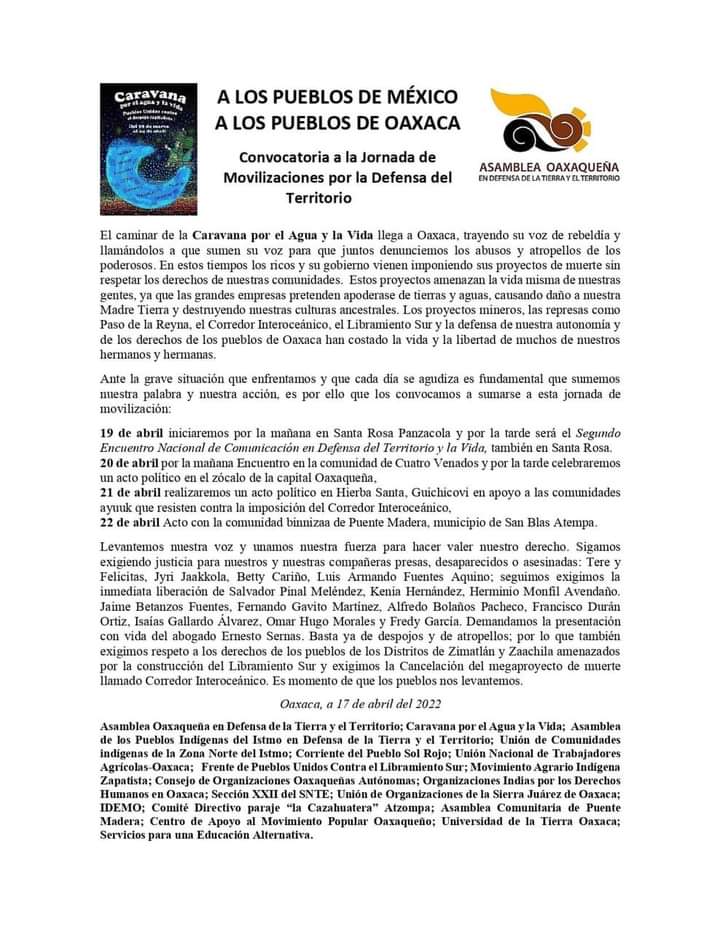 El caminar de la Caravana por el Agua y la Vida llega a Oaxaca, trayendo su voz de rebeldia y llamándolos a que sumen su voz para que juntos denunciemos los abusos y atropellos de los poderosos. En estos tiempos los ricos y su gobierno vienen imponiendo sus proyectos de muerte sin respetar los derechos de nuestras comunidades. Estos proyectos amenazan la vida misma de nuestras gentes, ya que las grandes empresas pretenden apoderase de tierras y aguas, causando daño a nuestra Madre Tierra y destruyendo muestras culturas ancestrales. Los proyectos mineros, las represas como Paso de la Reyna, el Corredor Interoceánico, el Libramiento Sur y la defensa de nuestra autonomia y de los derechos de los pueblos de Oaxaca han costado la vida y la libertad de muchos de nuestros hermanos y hermanas.