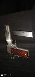 Al realizar los procedimientos policiales de inspección, se localizó un arma Calibre 45 en la cintura del sujeto, por lo que los agentes procedieron a la detención del mismo y el aseguramiento del arma, para posteriormente ponerlo a disposición de las autoridades correspondientes.