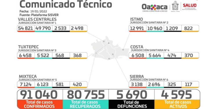 Oaxaca de Juárez, Oax. 19 de enero de 2022.- Al corte de este miércoles, los Servicios de Salud de Oaxaca (SSO), tienen contabilizados 863 casos nuevos de COVID-19, dos lamentables decesos y cuatro mil 595 casos activos en 185 municipios.