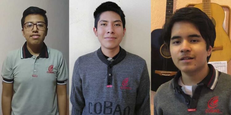 Santa Cruz Xoxocotlán, Oax. 24 de noviembre de 2021. Los estudiantes del Colegio de Bachilleres del Estado de Oaxaca (Cobao), Jonathan Pérez Juárez, Neftalí Adolfo Maceda Espinosa y David García Maldonado, obtuvieron medalla de plata en la 35 Olimpiada Mexicana de Matemáticas.