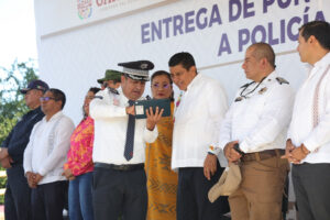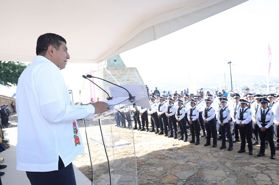 Teniendo como escenario el Monumento a Juárez ubicado en el Cerro del Fortín, el Mandatario Estatal expresó que desde el primer día la actual administración se ha preocupado por garantizar el equipamiento y generar condiciones dignas para el desempeño de la labor del cuerpo policiaco en la entidad.