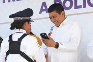 Oaxaca de Juárez, Oax. 20 de julio de 2023.- Con la finalidad de garantizar a la ciudadanía una actuación policial eficiente, el Gobernador del Estado de Oaxaca, Salomón Jara Cruz realizó la entrega de 200 dispositivos móviles PM85 a la Policía Vial Estatal.