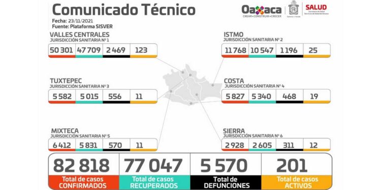 Oaxaca de Juárez, Oax., 23 de noviembre de 2021.- Oaxaca llegó este 23 de noviembre a 82 mil 818 casos confirmados por COVID-19, luego que los Servicios de Salud de Oaxaca (SSO) documentaran 41 contagios nuevos, en el reporte técnico oficial.