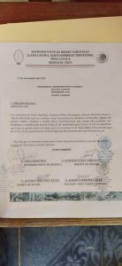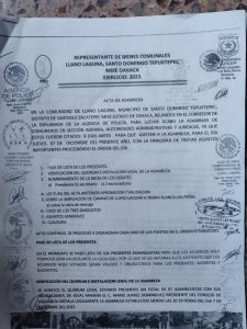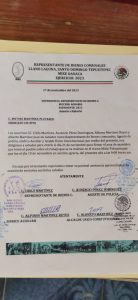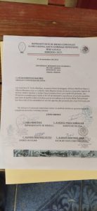 El Agente de policía Ausencio Pérez Domínguez acompañado de su Cabildo explicó que el jueves 7 de diciembre del año pasado la asamblea general del pueblo acordó por mayoría que la Confederación Internacional de Trabajadores será la única en trabajar el tramo 97+400 al 100+050 de Llano Laguna con trabajadores de la comunidad con la aportación del sindicato aprobado por la asamblea que es la construcción del techado de la cancha municipal.