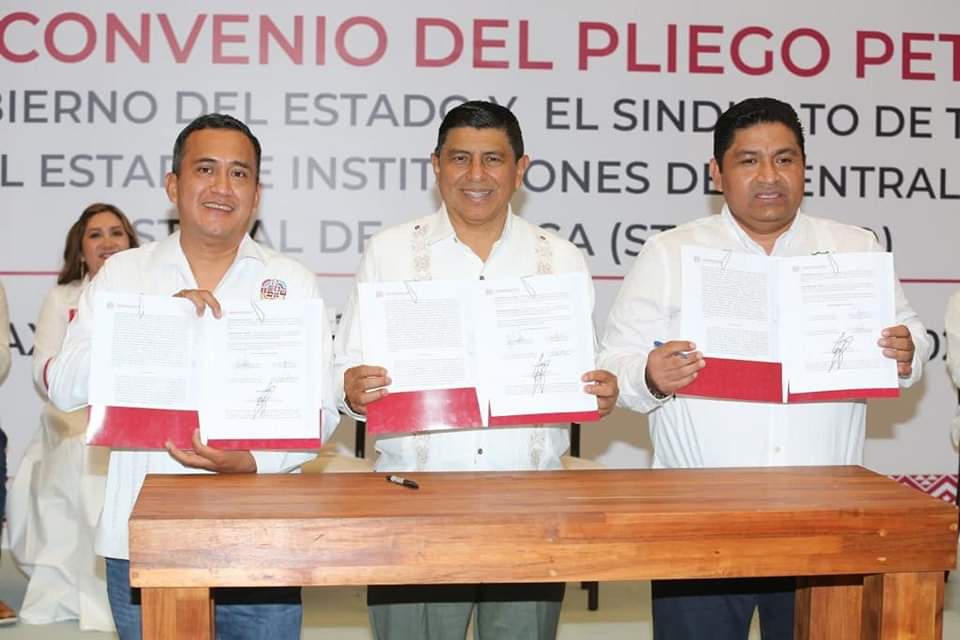 Oaxaca de Juárez, Oax., 25 de abril de 2023.- Teniendo como testigo de honor al gobernador del estado Salomón Jara Cruz, el secretario de Administración Antonino Morales Toledo y el secretario general del Sindicato de Trabajadores de los Poderes del Estado e Instituciones Descentralizadas de Carácter Estatal de Oaxaca, (STPEIDCEO), Pedro Castillejos Villalobos, firmaron el convenio del pliego petitorio 2023.