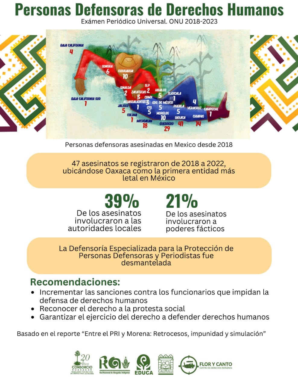 “El involucramiento de autoridades locales se documentó en 39% de los asesinatos, mientras el 21% provino de poderes fácticos. De ahí que la violencia está alimentada por la complicidad entre poderes fácticos y autoridades locales, impactando en la disminución de incidentes de seguridad antes de que ocurran los crímenes, situación que dificulta alertar a tiempo y salvaguardar la vida. La mayoría de personas defensoras asesinadas pertenecía a un pueblo indígena y defendía tierra y territorio”.