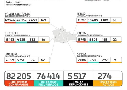 Por Jurisdicción Sanitaria, Valles Centrales, reporta 49 mil 966 confirmados, 149 activos y dos mil 453 decesos; Istmo con 11 mil 710, 36 activos y mil 189 muertes; Tuxtepec con cinco mil 493, 16 activos y 552 fallecimientos; Costa con cinco mil 793, 22 activos y 465 decesos Mixteca con seis mil 359, 42 activos y 566 defunciones; Sierra con dos mil 884 confirmados, nueve activos y 292 defunciones.