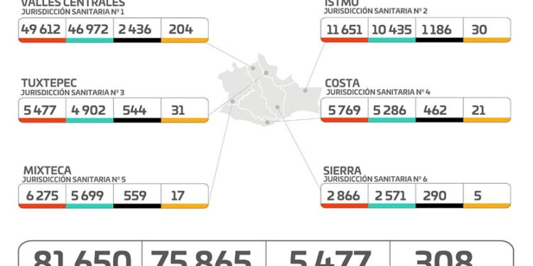 En relación al acumulado por Jurisdicción Sanitaria, Valles Centrales contabiliza 49 mil 612 casos confirmados y dos mil 436 defunciones, Istmo 11 mil 651 casos confirmados y mil 186 decesos, Tuxtepec cinco mil 477 casos confirmados y 544 muertes, Costa cinco mil 769 casos confirmados y 462 defunciones, Mixteca seis mil 275 casos confirmados y 559 decesos, Sierra dos mil 866 casos confirmados y 290 muertes.