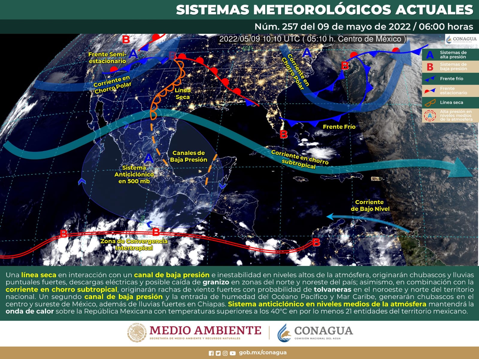 Este día, una línea seca sobre Coahuila en interacción con un canal de baja presión en el norte de México e inestabilidad en niveles altos de la atmósfera, originarán chubascos y lluvias puntuales fuertes, descargas eléctricas y posible caída de granizo en zonas del norte y noreste del país. Asimismo, en combinación con la corriente en chorro subtropical, originarán rachas de viento fuertes con probabilidad de tolvaneras en el noroeste y norte del territorio nacional. Un segundo canal de baja presión en el centro y sureste de México y la entrada de humedad del Océano Pacífico y Mar Caribe, generarán chubascos en dichas regiones, además de lluvias fuertes en Chiapas. Sistema anticiclónico en niveles medios de la atmósfera mantendrá la onda de calor sobre la República Mexicana con temperaturas superiores a los 40°C en por lo menos 21 entidades del país.