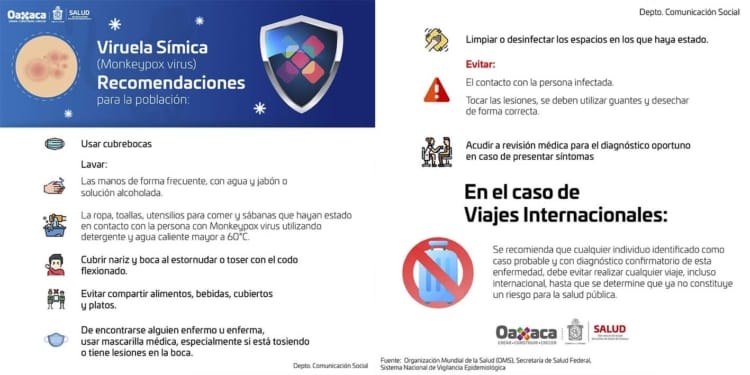 En este sentido recomendó a la población las siguientes medidas de prevención como: el uso correcto del cubrebocas, evitar el contacto con la persona infectada y tocar las lesiones; lavar frecuentemente las manos con agua y jabón, también la ropa, toallas, utensilios para comer y sábanas que hayan estado en contacto con la persona con Monkeypox virus utilizando detergente y agua caliente mayor a 60°C.